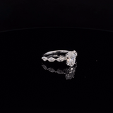 This unique oval cut diamond engagement ring features a prominent center stone that truly radiates light, drawing the eye with its graceful shape. What makes this ring unique is its decorative band, which is adorned with alternating small marquise diamonds that creates a lovely pattern along the sides. This intricate detail gives the ring a delicate yet distinctive look, different from a simple pave band. It's a wonderful choice for a unique engagement ring or a special anniversary gift that offers both classic appeal and artistic flair.