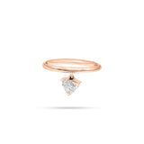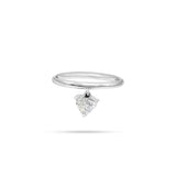 This unique ring features a dangling heart-shaped diamond. You can pair it with any diamond ring or can be worn all by itself. This simple and sleek design adds an elegant touch to your everyday look.